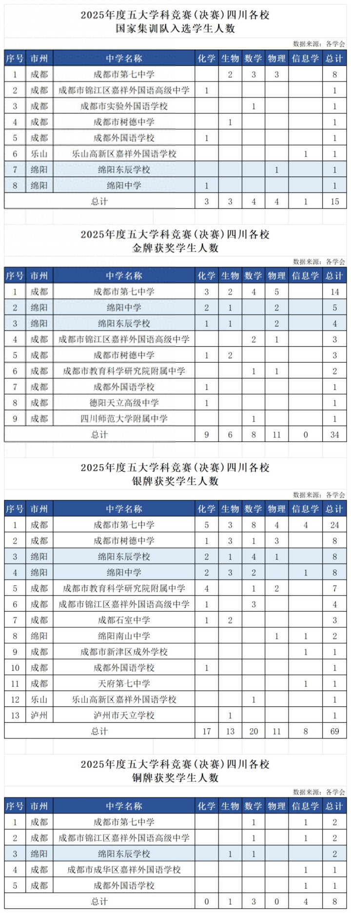 近日,2025年全国五大学科竞赛决赛成绩正式揭晓。四川省多所高中在数学、物理、化学、生物、信息学五大学科竞赛中表现突出,展现出扎实的学科培养实力。根据统计,四川省在国家级奖项方面共产生国家集训队队员15名、金牌49枚、银牌69枚。