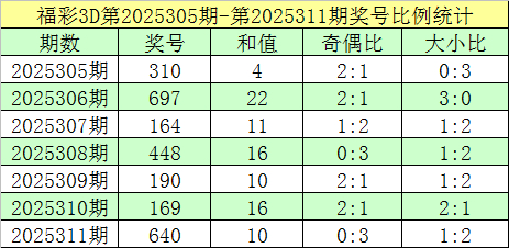 福彩3D第2025311期回顾:奖号为640,奖号奇偶比为0:3,大小比为1:2,和值为10,类型为组六。