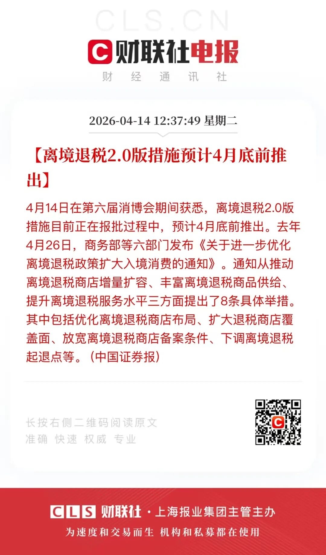 4月14日,据财联社消息,记者在第六届消博会期间获悉,离境退税2.0版措施目前正在报批过程中,预计4月底前推出。